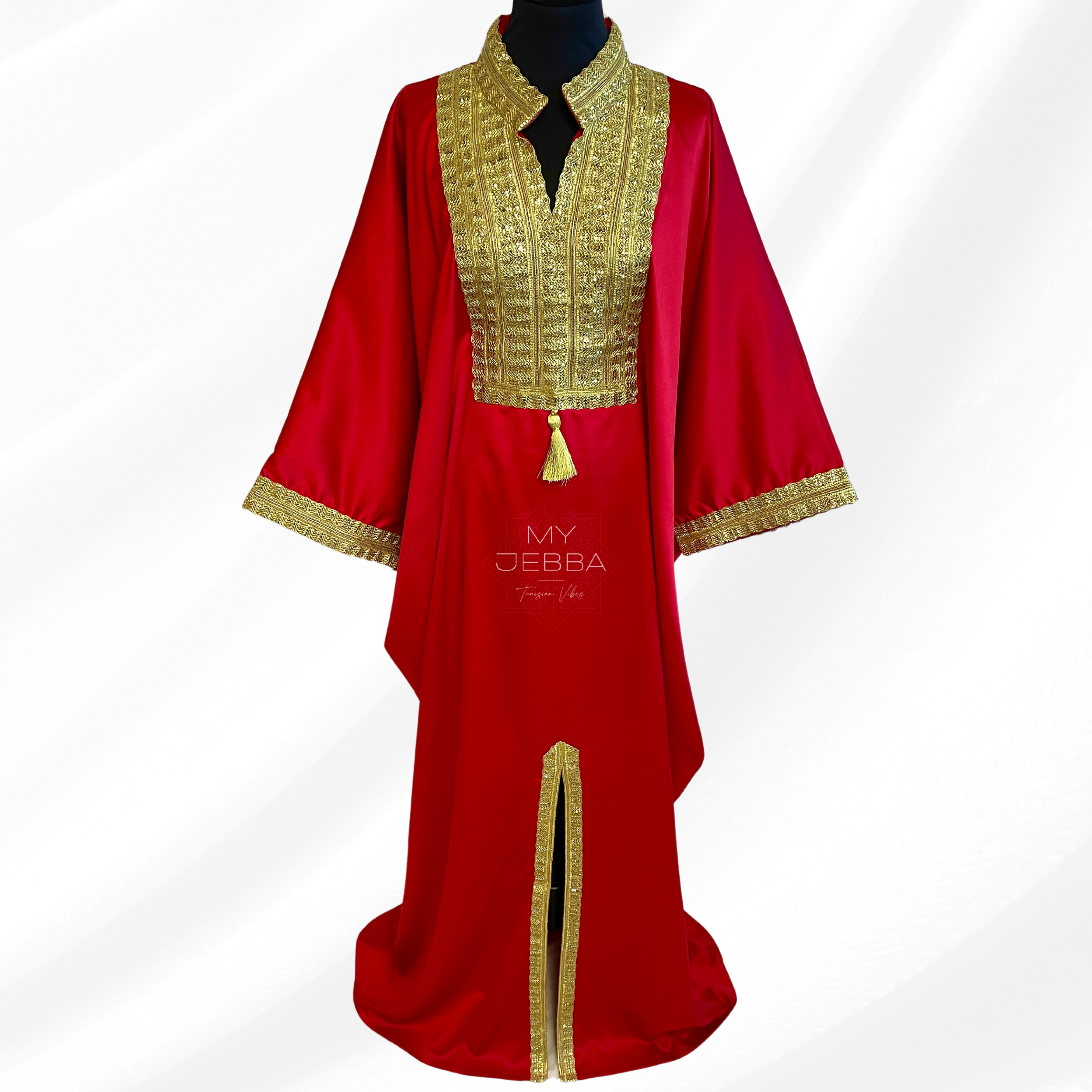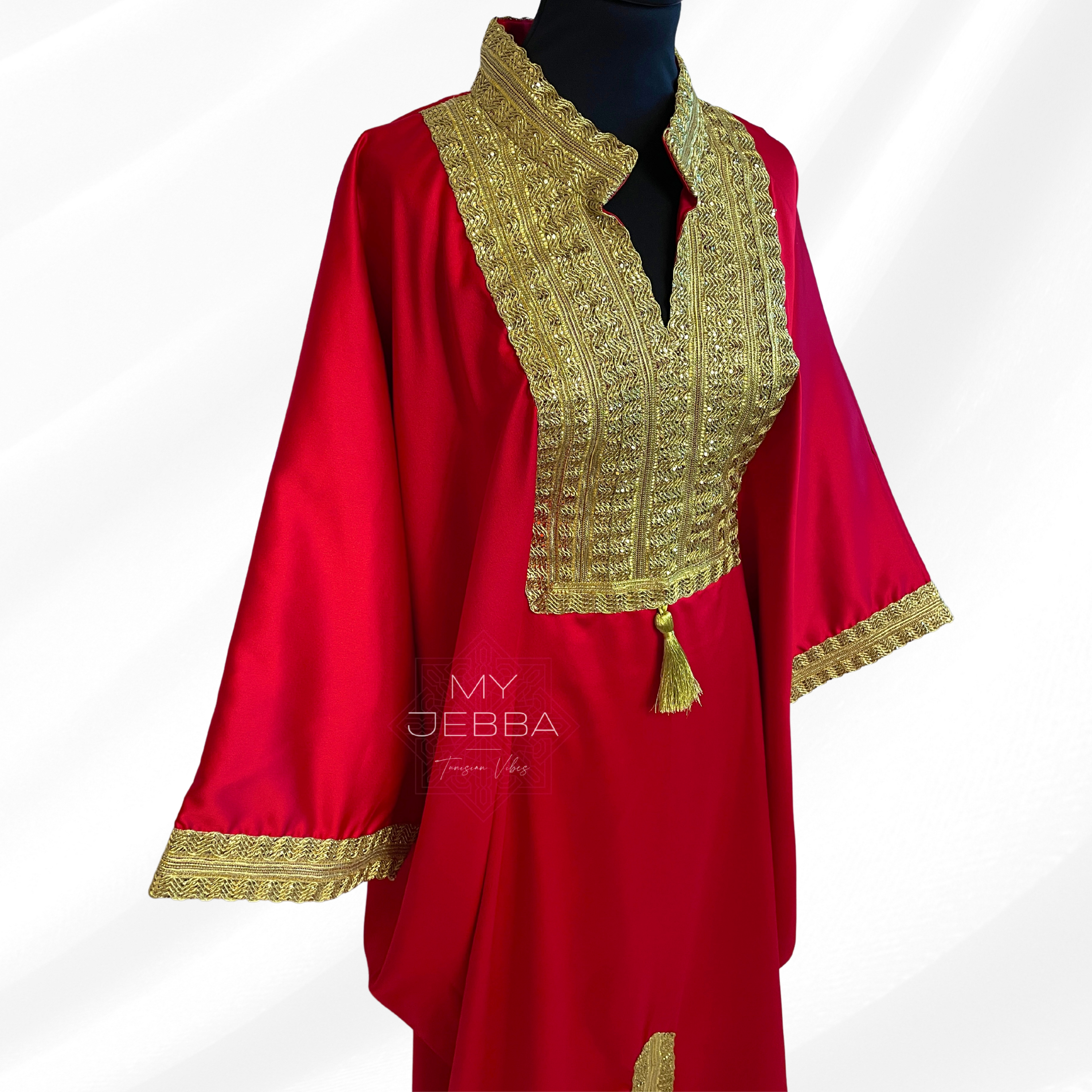 Découvrez la Jebba EMNA, une robe traditionnelle tunisienne en satin. Profitez de son allure traditionnelle et élégante tout en étant à l'aise. Parfaite pour toutes les occasions !