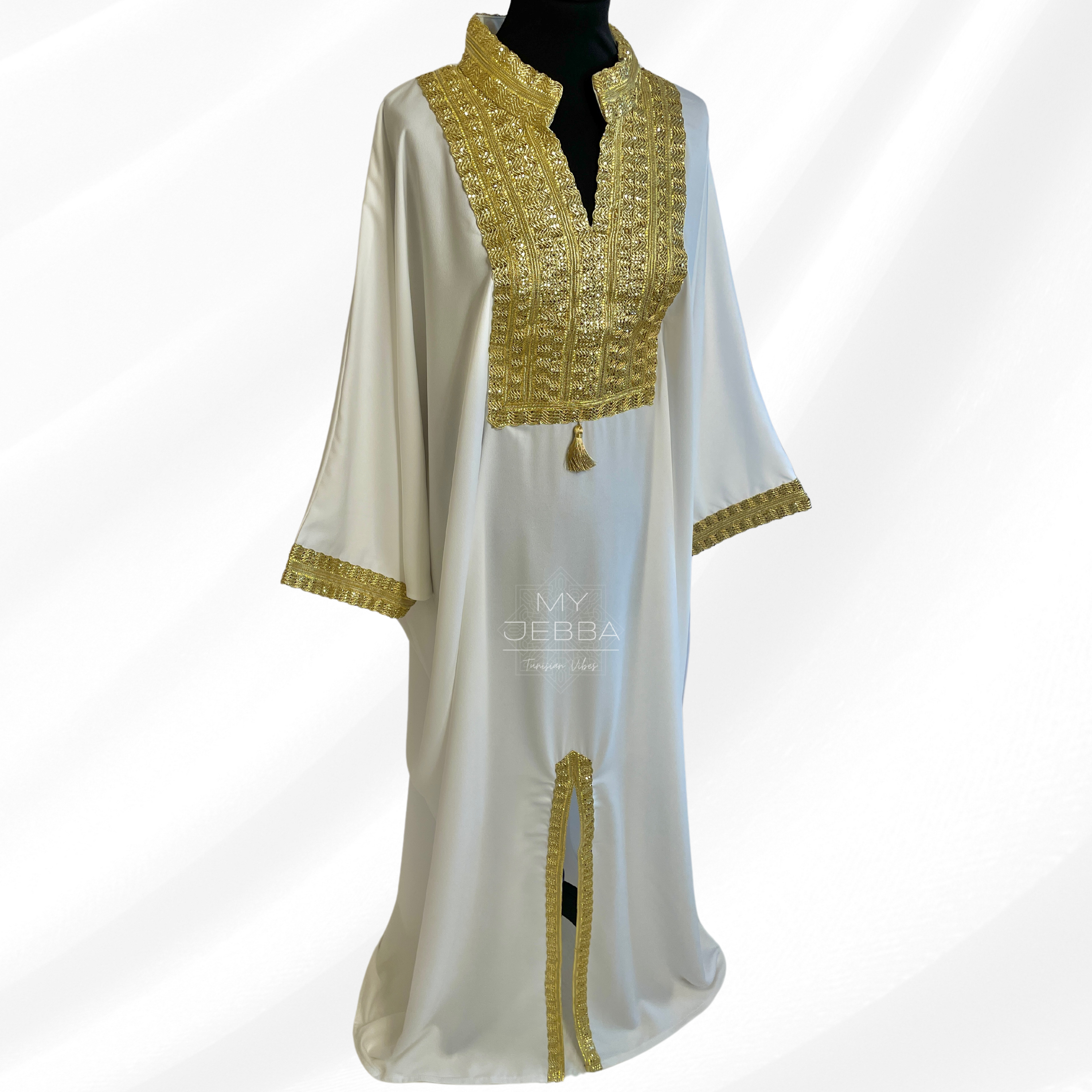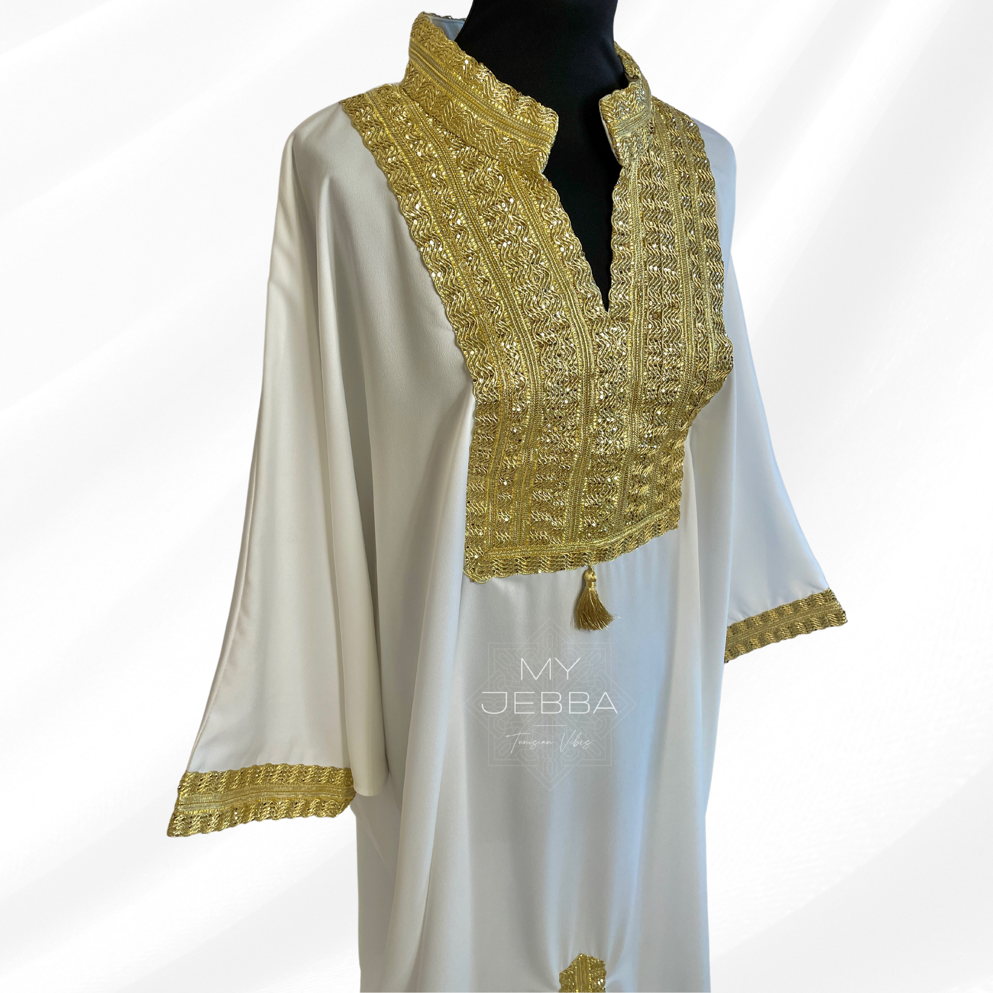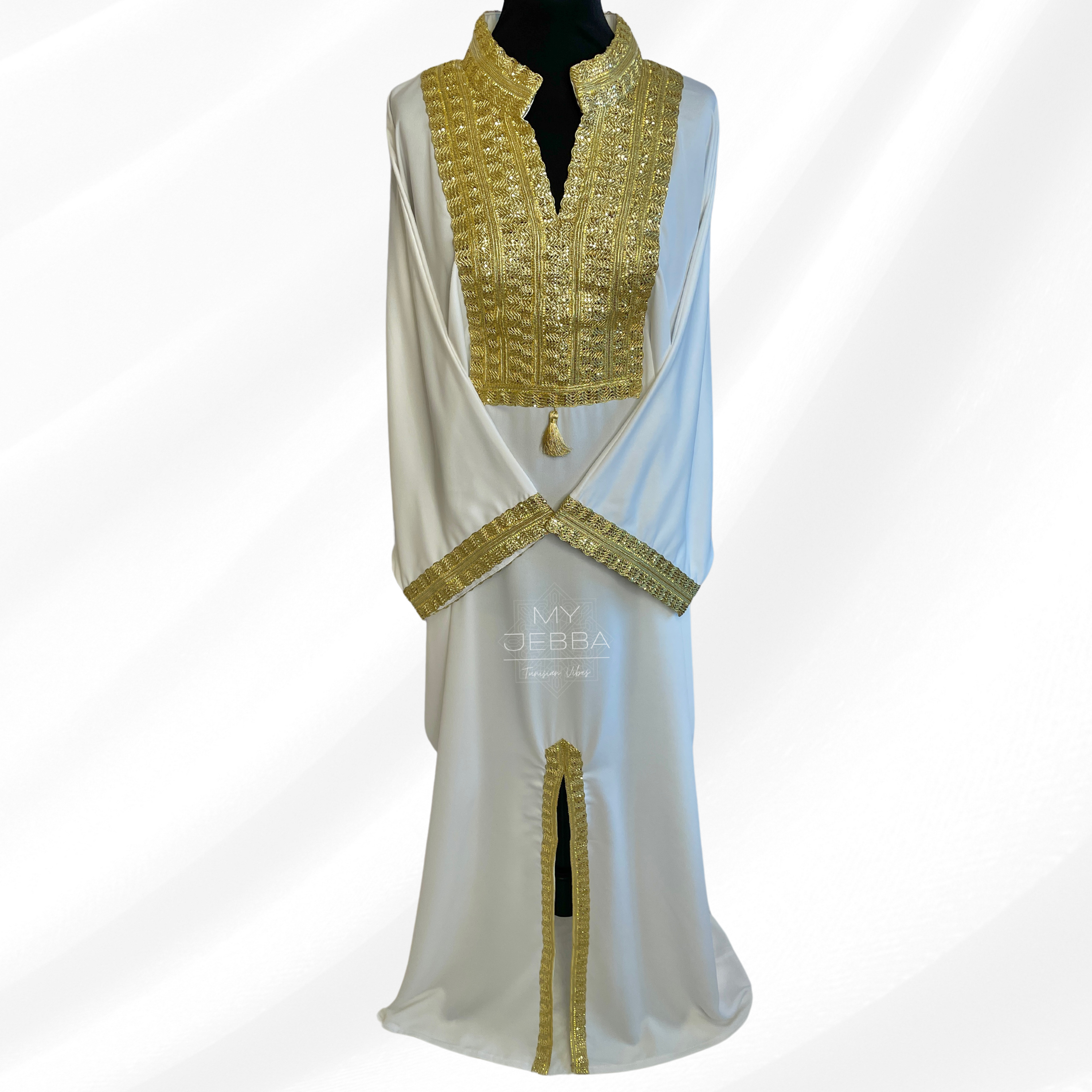 Découvrez la Jebba EMNA, une robe traditionnelle tunisienne en tissu crêpe satin. Profitez de son allure traditionnelle et élégante tout en étant à l'aise. Parfaite pour toutes les occasions et idéale pour les futures mariées !