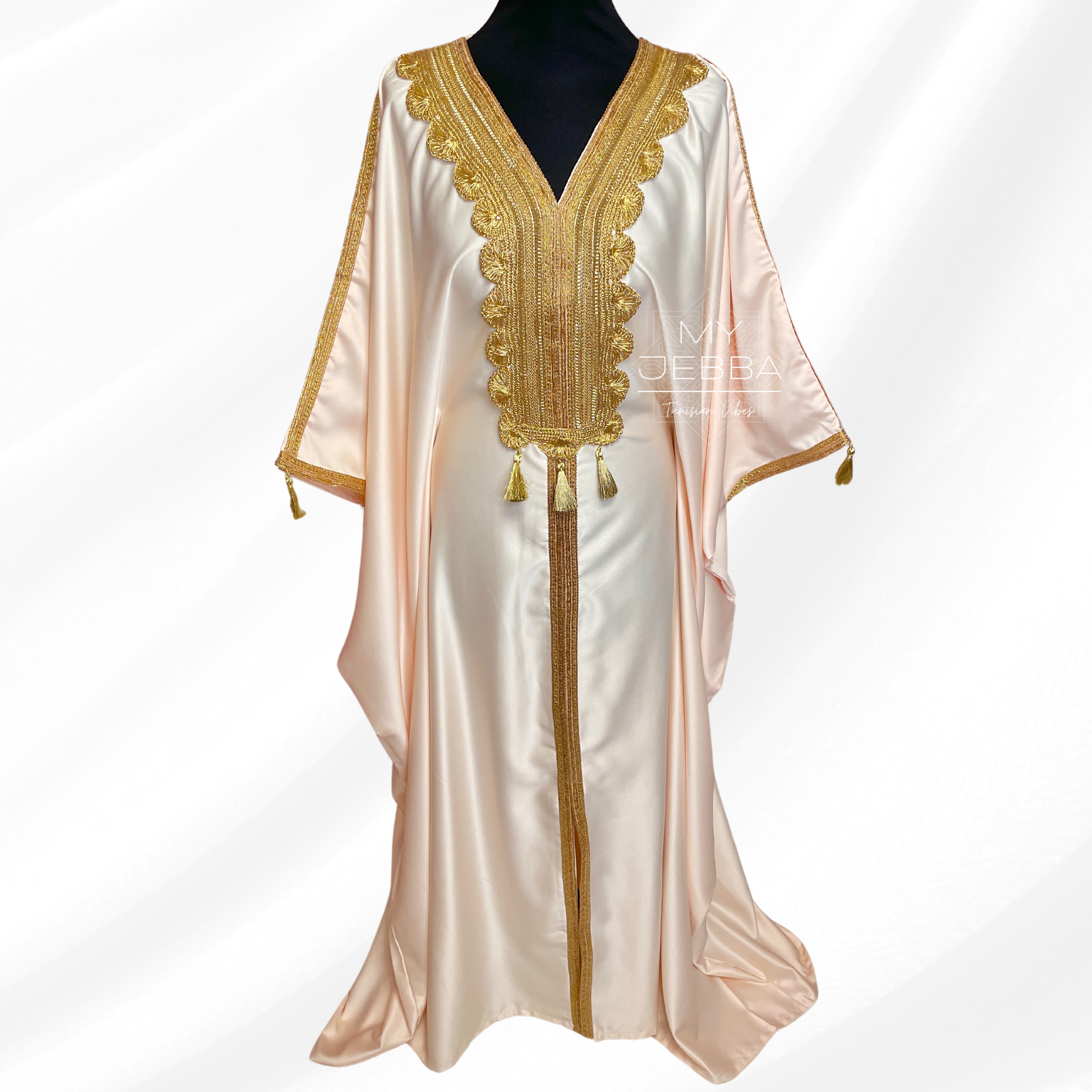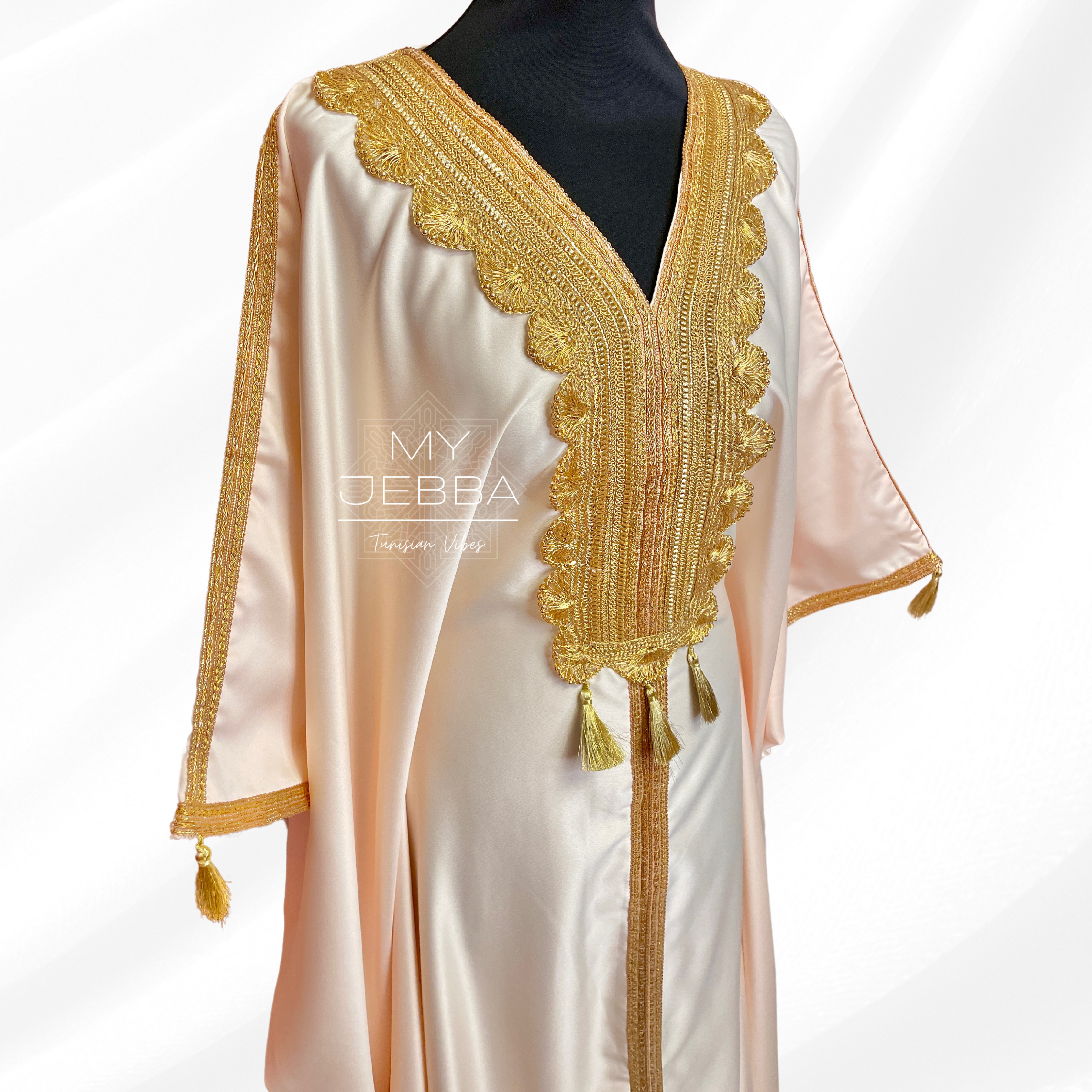 Découvrez la beauté et l'élégance de la Jebba SOUHIR. Confectionnée en satin de haute qualité, cette robe traditionnelle tunisienne est à la fois chic et confortable. Son tissu non transparent vous assure une confiance totale. Taille unique, elle convient à toutes les morphologies. Soyez la plus belle avec la Jebba SOUHIR ! Parfaite pour les futures mariées !